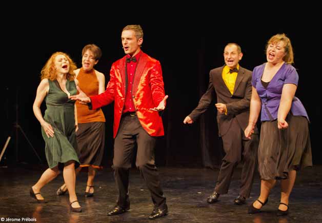 Le principe qui a guidé ma mise en scène, à moins qu’il ne s’agisse d’un « accompagnement artistique et orienté », avec les CINQ DE COEUR a été de les emmener dans mon imaginaire en partant de leur personnalité et de leur voix, de faire ressortir la fantaisie de chaque chanteur et, parce que je suis clown, leur propre dérisoire, leur fragilité qui les rendra drôles et touchants.