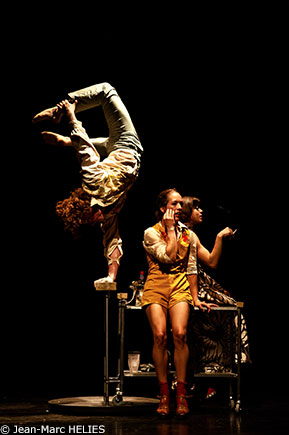 Des acrobates, des clowns, des comédiens, voilà ce que sont les six artistes du Cirque Leroux. On passe un moment formidable à les regarder danser, voler, sauter et jouer devant nous, et la mise en scène - musiques, projections, lumières, décors - nous fait vivre des instants magiques. Ces jeunes gens sont très talentueux et très drôles, les enfants dans la salle rient aux éclats, ce qui ne trompe pas ! J’ai pensé parfois en les regardant aux pitreries géniales du grand Christian Hecq !