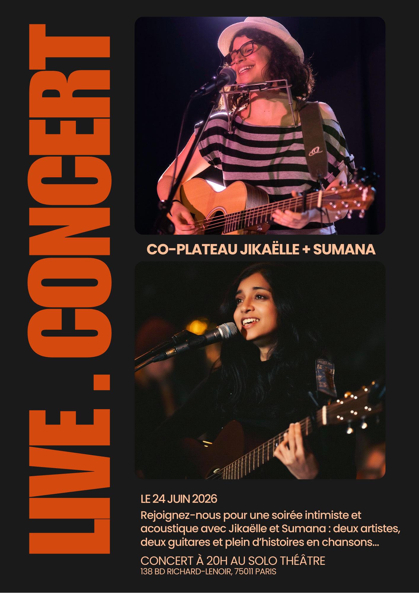 Rejoignez-nous pour une soirée intimiste et acoustique avec Jikaëlle et Sumana : deux artistes, deux guitares et plein d’histoires en chansons…