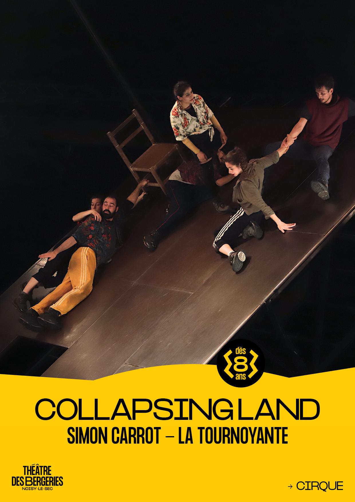 En utilisant la force électromagnétique, Simon Carrot met en jeu de nouveaux rapports au corps, au mouvement et à l’espace. Les circassiens repoussent toujours plus loin les limites de l’acrobatie. Avec l’inexorable inclinaison du plan, Collapsing Land raconte l’absurdité de notre fuite en avant dans un monde qui bascule, nous invitant avec finesse à modifier notre vision du réel et à nous reconnecter avec la nature.