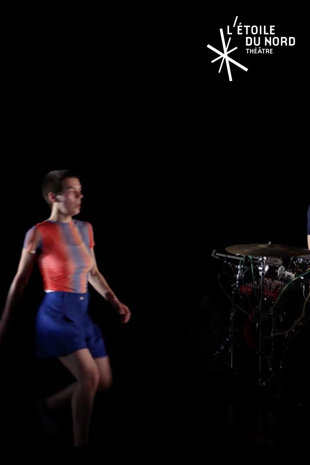 Au centre du plateau, un musicien avec sa batterie va lancer trois corps tournants dans un mouvement circulaire autour de lui.