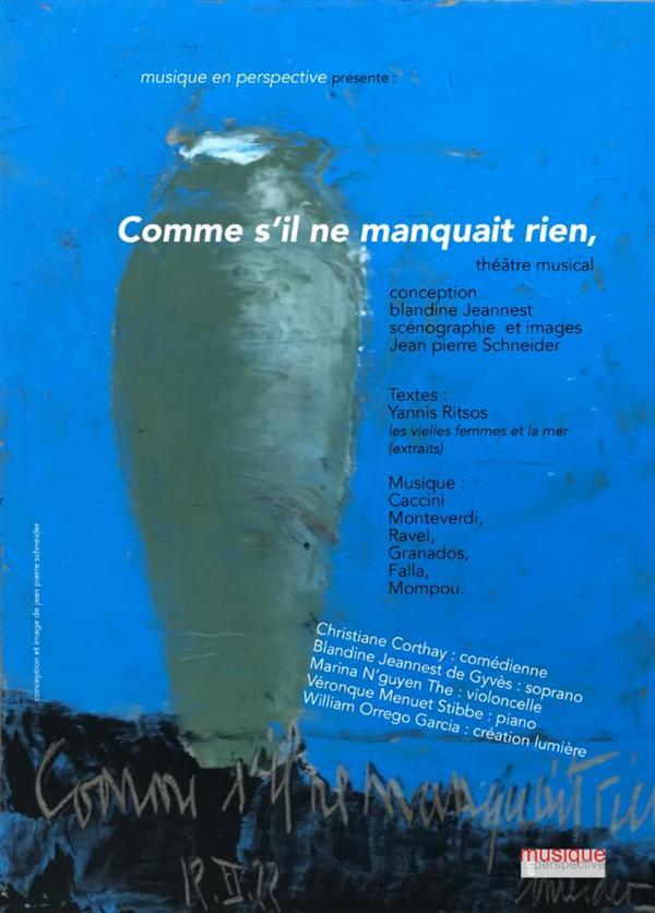 Musique en perspective présente Comme s'il ne manquait rien, théâtre musical conçu par Blandine Jeannest de Gyves, avec des textes de Yannis Rítsos extraits de Les vieilles femmes et la mer et des musiques de Bach, Caccini, Ravel, Granados et Mompou.