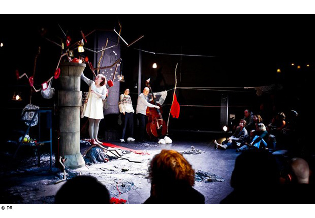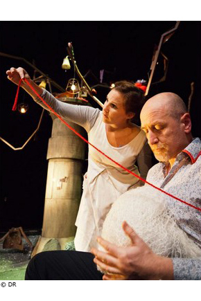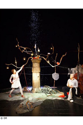 Entrez sur le plateau comme dans un cocon douillet. Devant vous se dresse un arbre bobine, point d’ancrage autour duquel la petite fille va accomplir son voyage initiatique. Différents langages s’y répondent : jeu, marionnette, théâtre d’ombre, tricot et musique…