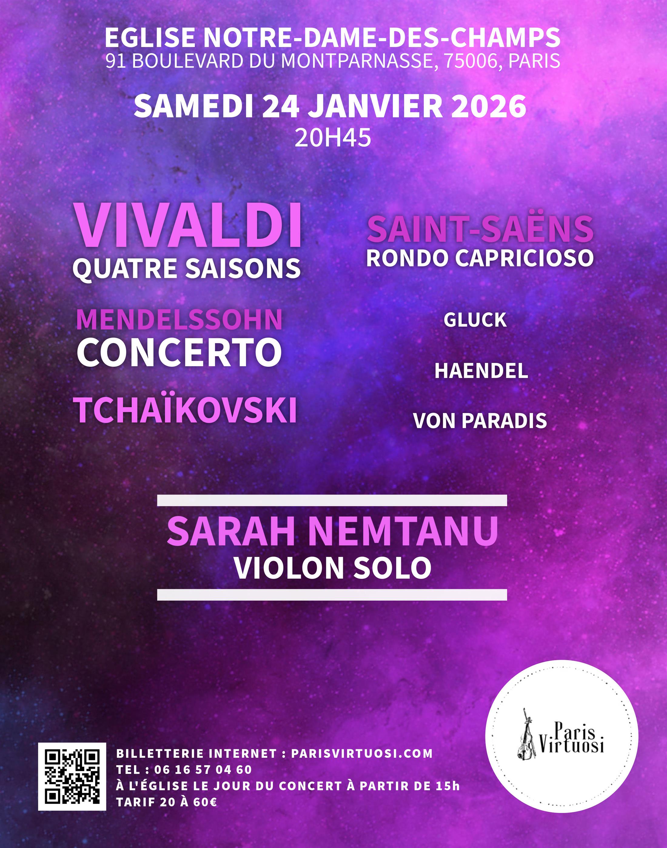 Sarah Nemtanu, au violon, et l'Orchestre Paris Virtuosi offrent un programme centré sur Vivaldi, Mendelssohn, Tchaïkovski, Saint-Saëns...