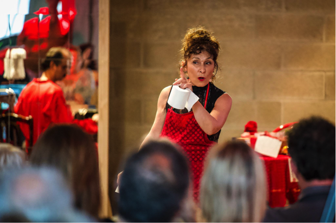 Sur la scène, un espace entre deux portes, celle, lumineuse qui mène au bal « la Milonga », lieu de plaisir et du paraître, et l’autre, plus discrète, par laquelle on accède aux toilettes, lieu de l'intime par excellence.