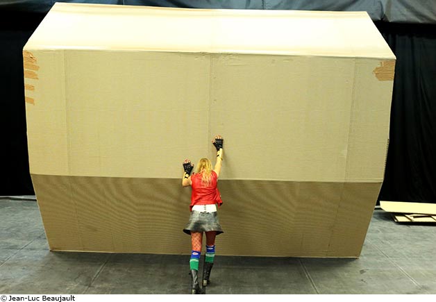Alors Phia Ménard construit en scène, seule, un Parthénon de carton. Étaler, tracer, couper, assembler, poser. Tout semble parfait si ce n’est ce nuage qui s’assombrit au-dessus de la scène. Alors, peut-être, un éclair, une légère brise, puis une pluie, voire des trombes d’eau ! Et la construction s’effondre malgré l’énergie déployée pour le sauver. C’est une bouillie, une mélasse dans laquelle les corps sont noyés… et il faut encore tout recommencer. Du scotch et du carton pour embrasser la matière qu’aime tant Phia Ménard dans une métaphore édifiante d’une Europe inlassablement en reconstruction.