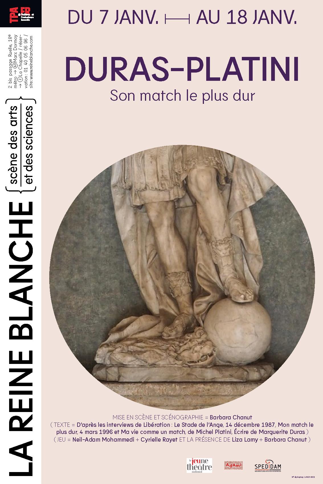 Décembre 1987. Marguerite Duras réalise une interview de Michel Platini, publiée dans Libération. Barbara Chanut s'empare de cet échange et fait revivre ces monstres sacrés. Joué par deux comédiens complices, au plus près des spectateurs, le match est passionnant.