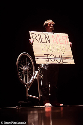 Dad is dead : Tout en abordant le développement durable, les fausses origines des fameuses études de genre et les mystères de l’identité sexuelle, ce duo, en proie aux liens ambigus qui l’animent, s’interroge sur l'idée même du militantisme et la nécessaire limite qu’entraîne une volonté de vouloir faire le monde à son image. Sur un vélo acrobatique les deux comparses flirtent avec le cirque et le théâtre, livrant une discussion de haut vol où la parole est fragmentée et le mouvement permanent.