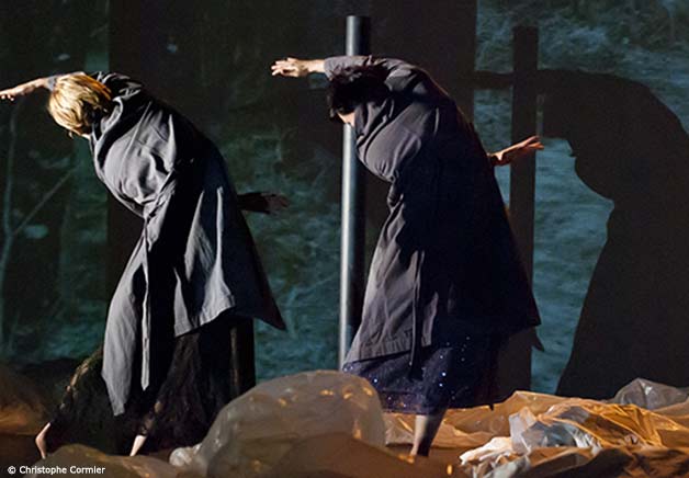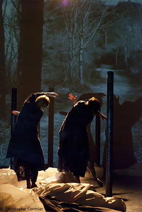 Et pour mieux transfigurer cette nuit, la musique d’Arnold Schönberg vient guider les pas des danseurs... La plupart des spectacles de la compagnie alleRetour sont étroitement liés à l’écriture musicale (Passagers en 1996, Moult en 2002, Sequenza en 2004 ou encore Sarao en 2008). Dans(e) la forêt revisite à sa manière l’œuvre pour sextuor à cordes composée par Arnold Schönberg en 1899. Des extraits de La nuit transfiguré accompagnent la petite fille tout au long de son odyssée, et nous font parcourir la gamme des émotions qui vont de l’angoisse, à la tendresse, voire à l’extase procurée par la poésie de cette échappée onirique.