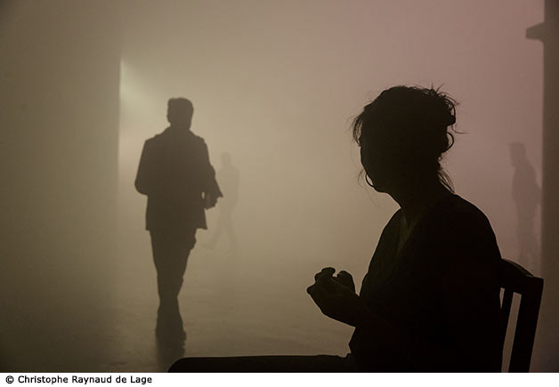 En parallèle du poème, une partition de style cinématographique se déroulera. Le Théâtre des Bouffes du Nord sera entièrement plongé dans une fumée opaque, découpée par des jeux de lumière et rais de vidéo, comme autant d’espaces de rencontre, de jeu, tantôt espace intime, dans la pénombre, tantôt exposé à la lumière, public. Le spectateur sera pris avec les actrices dans cette même fumée, dans cette même rencontre. Ses repères visuels troublés, mais avec un rapport très proche et intime au texte, les voix des actrices dans le creux de l’oreille.