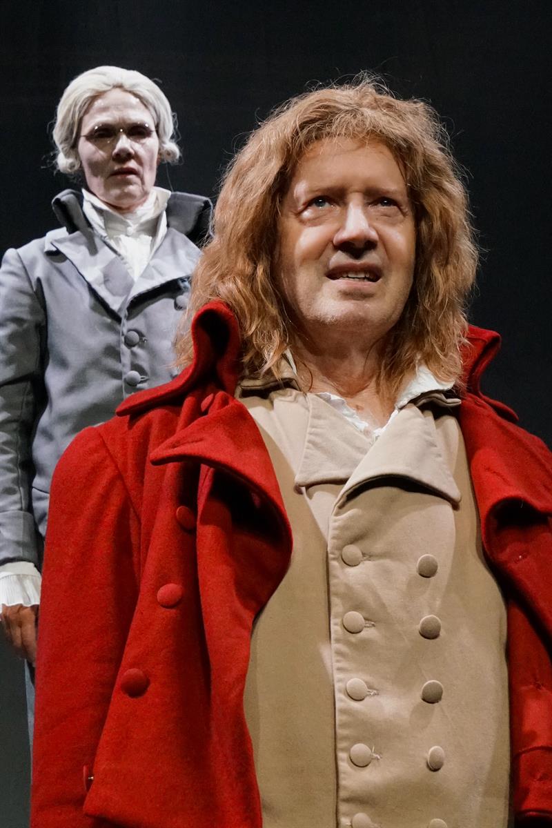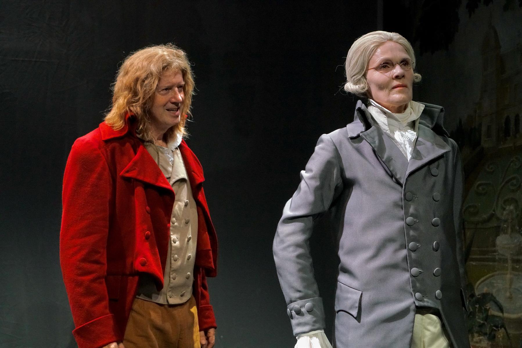 1ER TEMPS : le spectacle lui même. S’opposent un Danton, bon vivant truculent et un Robespierre austère et coincé. Hugues Leforestier campe parfaitement le premier, Nathalie Mann s’accommode du second, personnage conçu de façon un peu étroite. Je ne sais si cette opposition correspond à la réalité historique. Le dialogue commence de manière pas très dynamique, on est loin d’une joute. Puis viennent des nuances, des oppositions, des accords et des désaccords et la pièce prend du relief, mais les différents moments semblent assemblés sans logique évidente ni progression dramatique claire. Il met aussi dans la bouche de Danton des propos de Condorcet et emploie des terminologies anachroniques. Le tout se truffe de références sans grand intérêt à l’actualité de notre siècle et l’on en vient à douter de la démarche de l’auteur : veut-il nous parler de nous ou de Danton et Robespierre ? 2ÈME TEMPS : Après les saluts, Leforestier invite les spectateurs à le rejoindre devant le théâtre où il tient conférence : il nous explique ce qui est vrai, ce qui ne l’est pas, il semble maîtriser son sujet et celui-ci le passionne. QUESTION : plutôt qu’écrire ce spectacle de façon un peu bancale, pourquoi l’auteur ne s’est-il pas contenté de mettre sur scène pour les interviewer Danton, Robespierre, mais aussi Condorcet, voire d’autres révolutionnaires, en ôtant de leurs bouches tous propos qu’ils n’ont pas tenus eux-mêmes et tous termes anachroniques ?