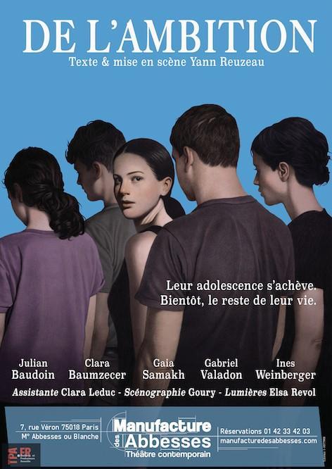 Quelle belle équipe et quel travail de pro. Bravos à ces 5 jeunes comédiens, époustouflants de vérité, qui nous emportent dans le tourbillon de leur jeunesse en endossant chacun leur rôle à la perfection sur le thème du Mal être et du Questionnement des Jeunes . Avec une mention toute particulière pour le choix de musiques si émouvantes comme celles de Jeff Buckley ou de Patrick Watson . Courrez voir " De l'Ambition " car tout y est et surtout emmenez vos Jeunes, ils vont véritablement se régaler !
