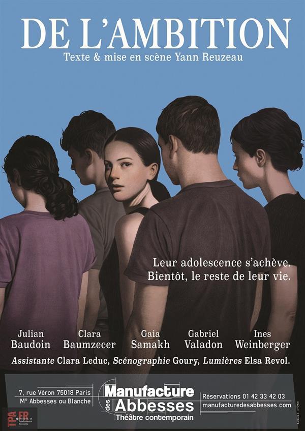 Quelle belle équipe et quel travail de pro. Bravos à ces 5 jeunes comédiens, époustouflants de vérité, qui nous emportent dans le tourbillon de leur jeunesse en endossant chacun leur rôle à la perfection sur le thème du Mal être et du Questionnement des Jeunes . Avec une mention toute particulière pour le choix de musiques si émouvantes comme celles de Jeff Buckley ou de Patrick Watson . Courrez voir " De l'Ambition " car tout y est et surtout emmenez vos Jeunes, ils vont véritablement se régaler !