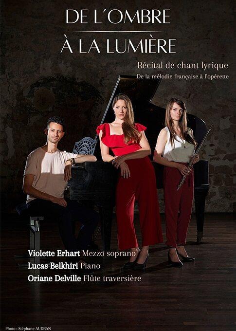 De Fauré à Offenbach, de la mélodie française à l’opérette, de l’ombre à la lumière. C’est le voyage que propose ce récital original, interprété par trois jeunes musiciens : une chanteuse (mezzo soprano), une flûtiste, un pianiste.