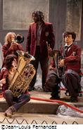 Alice Laloy met en scène une tribu de musiciens subsistant dans une atmosphère suffocante, et fait théâtre du souffle même. Quand le théâtre d’objets et de machines rencontre le spectacle musical.