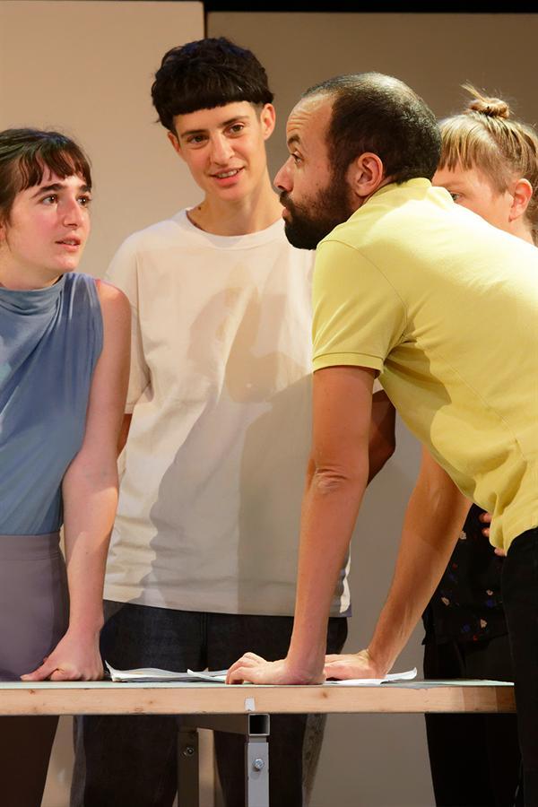 Souvent Adeline Rosenstein est derrière son pupitre, occupée à nous communiquer ce qu’elle a pu rassembler et ce qu’elle a pu comprendre : faits, cartes, arguments. Mais souvent aussi, elle laisse la scène à ses acteurs pour des saynètes, issues entre autres de pièces arabes inconnues ici, qui reconstruisent autrement dans l’espace les questions que pose et se pose la conférencière. Nous sommes donc deux fois les témoins de ce long conflit : en tant que citoyens et en tant que spectateurs.