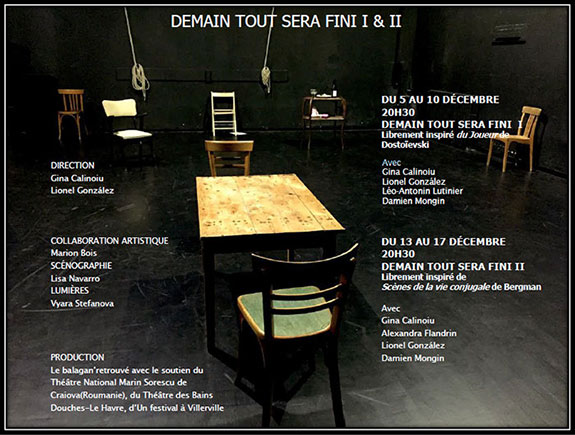 À l’origine de ces projets, il y a la rencontre d’une actrice et d’un acteur, d’une roumaine et d’un français, de Gina Calinoiu (Théâtre National de Craiova) et de Lionel González (D’ores et déjà, La Vie brève), et leur désir de faire du théâtre ensemble. La structure est encore à créer, le nom est encore à trouver, mais le désir est là, en mouvement, déjà.