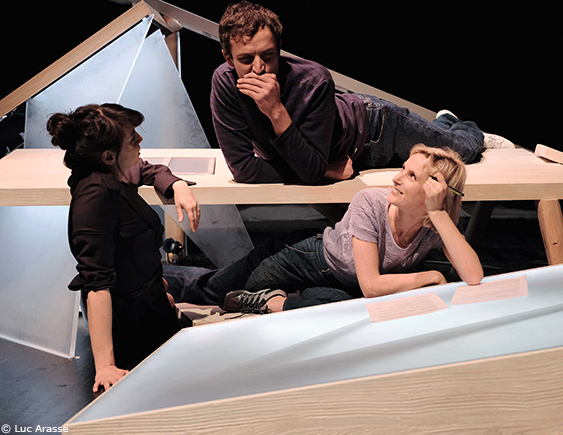 Ainsi s’entrelacent au plateau l’adaptation stricte du récit autofictionnel de Mathieu Riboulet, porté par trois voix ; la reconstitution documentaire du procès de Rob Lawrie ; des situations d’improvisation autour de la désobéissance et de la communauté puisées dans les films de Rivette qui traitent souvent d’une communauté secrète, les films où les philosophes Sandra Laugier et Stanley Cavell voient le lien entre (dés)obéissance civile et comédies du remariage, des situations de jeu où l’on fait ou non confiance à l’autre…