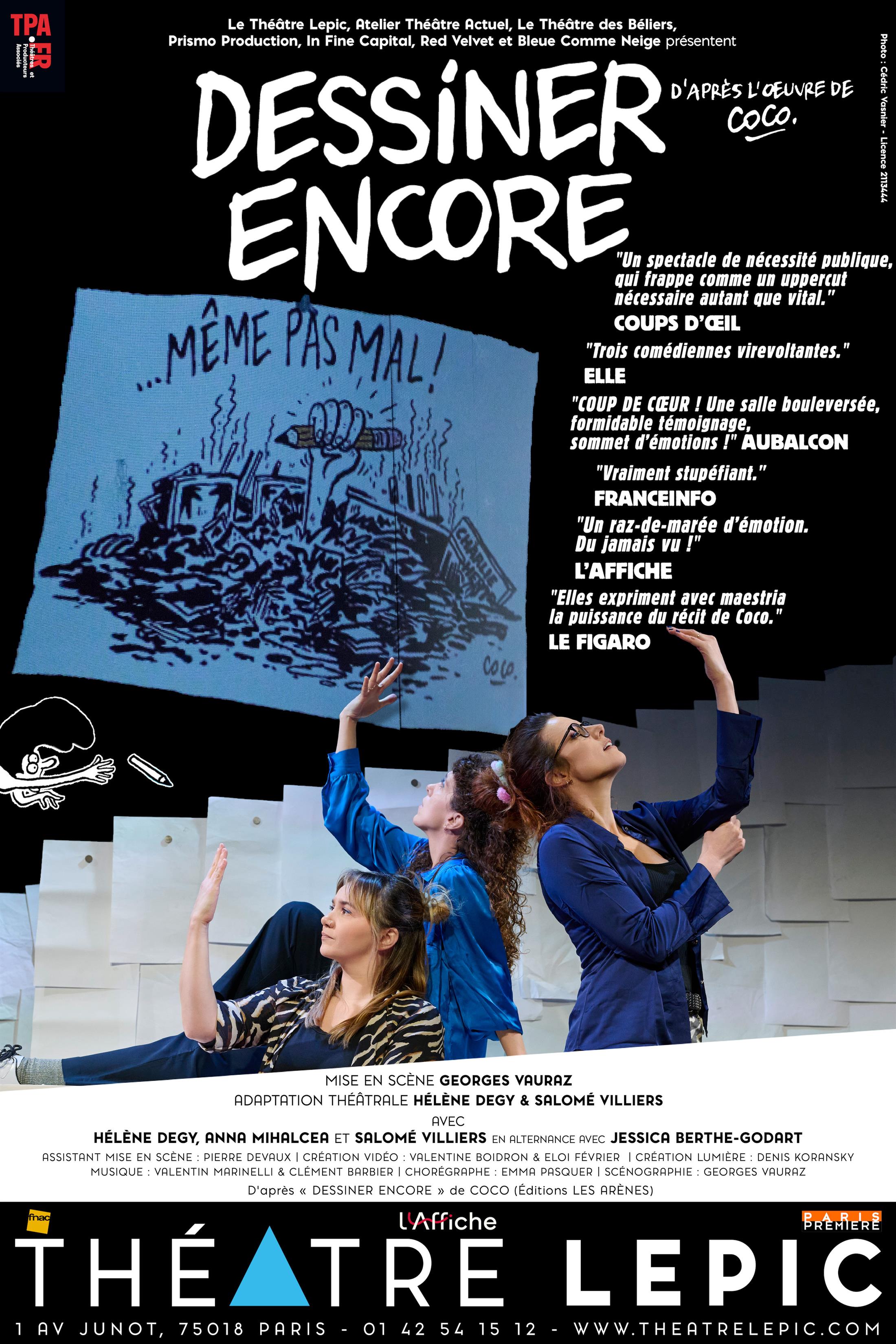 Dans cette adaptation théâtrale de la bande dessinée à succès Dessiner encore, œuvre poétique et profondément humaine, Coco revient sur cet instant suspendu, sur l’après, et sur les questions qui la hantent encore : Et si elle avait fait quelque chose ? Et si elle avait appelé au secours ? Et si… Parce qu’un dessin ne tue pas, Coco nous parle et dessine avec générosité, humour et pudeur. Elle nous emmène dans un voyage intérieur d’une rare sensibilité, où se mêlent ses blessures, ses élans de vie et ses plus belles rencontres, humaines et artistiques, au cœur de la rédaction de Charlie Hebdo.