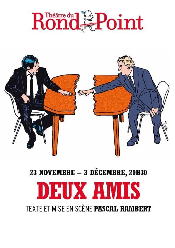Deux amis c’est un couple Stanislas Nordey et Charles Berling vivant ensemble et travaillant ensemble qui remontent 4 Molière. Pendant la répétition et les questions de préparation du travail Stanislas lit comme cela nous arrivera à tous sur le portable de charles un sms qu’il n’aurait pas du lire. À partir de là c’est l’explosion ultra violente en direct et en temps réel d’un couple d’artistes.