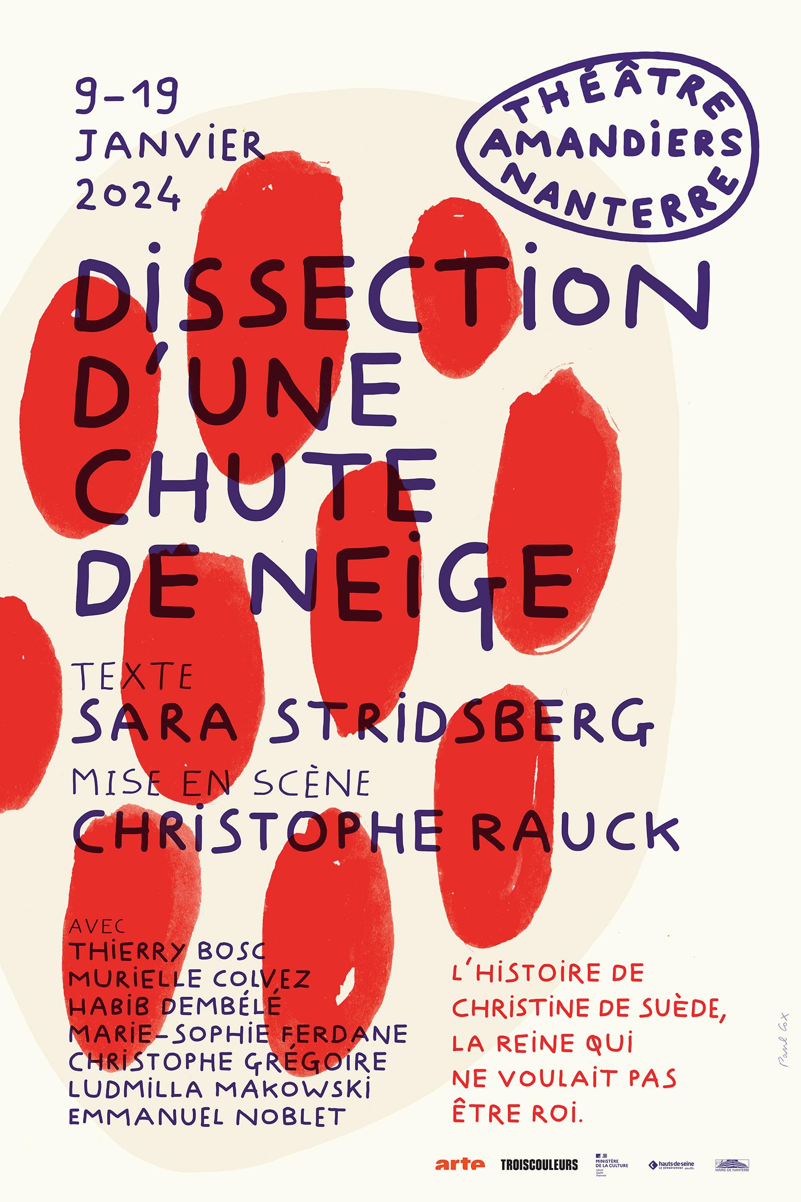 Deuxième pièce de l’autrice suédoise Sara Stridsberg mise en scène par Christophe Rauck, Dissection d’une chute de neige interroge les attributs du pouvoir. Enfermée dans une grande boîte transparente, à la fois cage et refuge, Christine se heurte aux parois de verre, tel un papillon piégé. Figure sulfureuse, féministe et poétique, elle est tiraillée entre passion et raison, pulsions despotiques et désir de liberté. Héroïne moderne, elle se débat pour conserver les rênes de sa destinée.