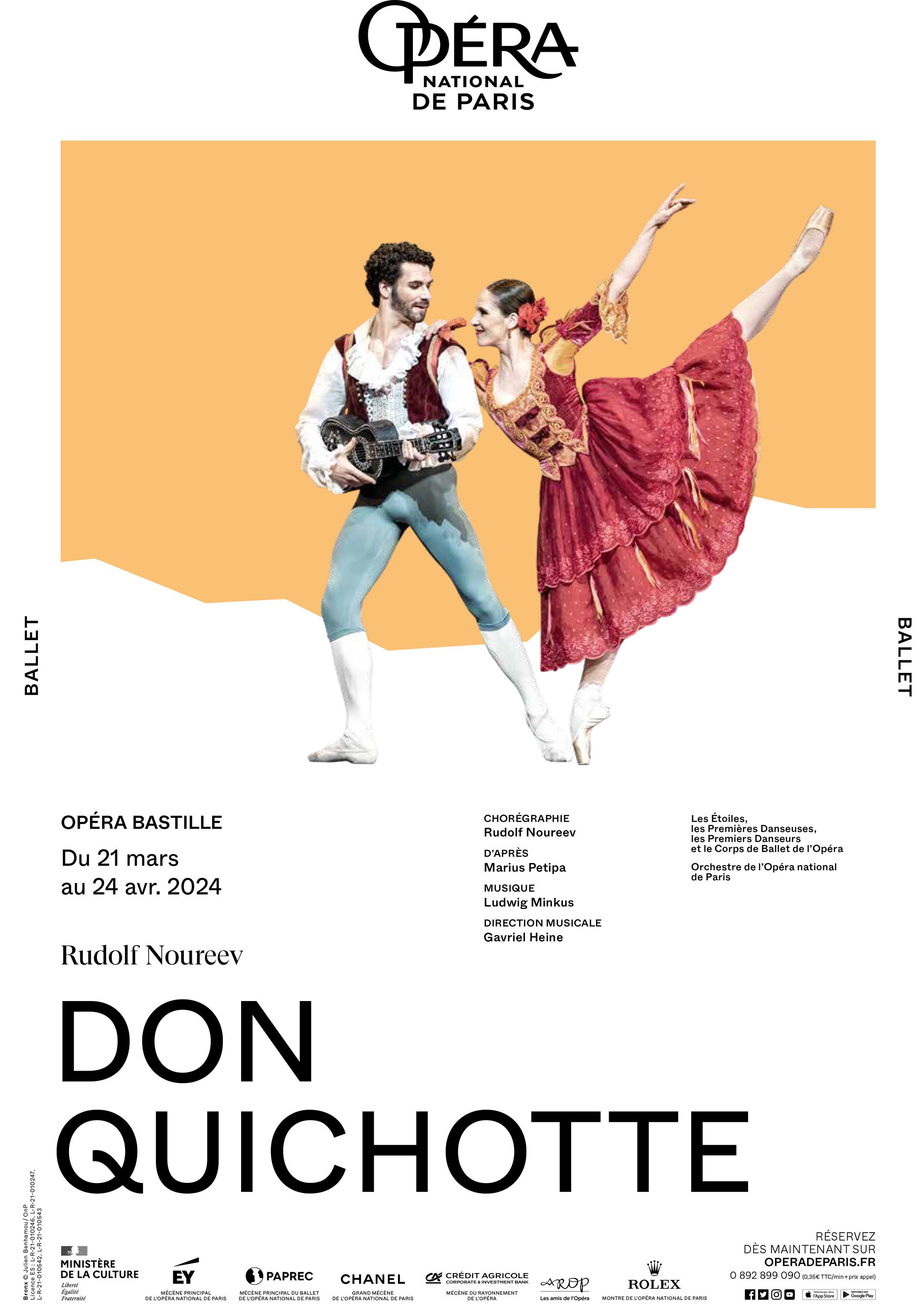 Écrit au XVIIe siècle, le roman de Cervantès raconte les aventures de Don Quichotte, un idéaliste qui vit dans les livres et qui décide un jour de cavaler à travers l’Espagne aux côtés du naïf Sancho Pança. Dans le ballet de Noureev, ils rencontrent Kitri et Basilio. Ces deux amants emploient toutes les ruses – du spectacle de guignol au faux suicide – pour se retrouver malgré la résistance du père de Kitri. C’est finalement Don Quichotte qui amène l’heureux dénouement après avoir lutté contre les moulins à vent et croisé la route de Cupidon, Dulcinée et la Reine des dryades. Les costumes et les décors chatoyants subliment une œuvre vive et réjouissante.