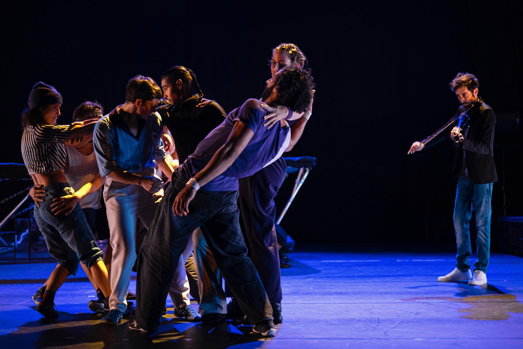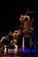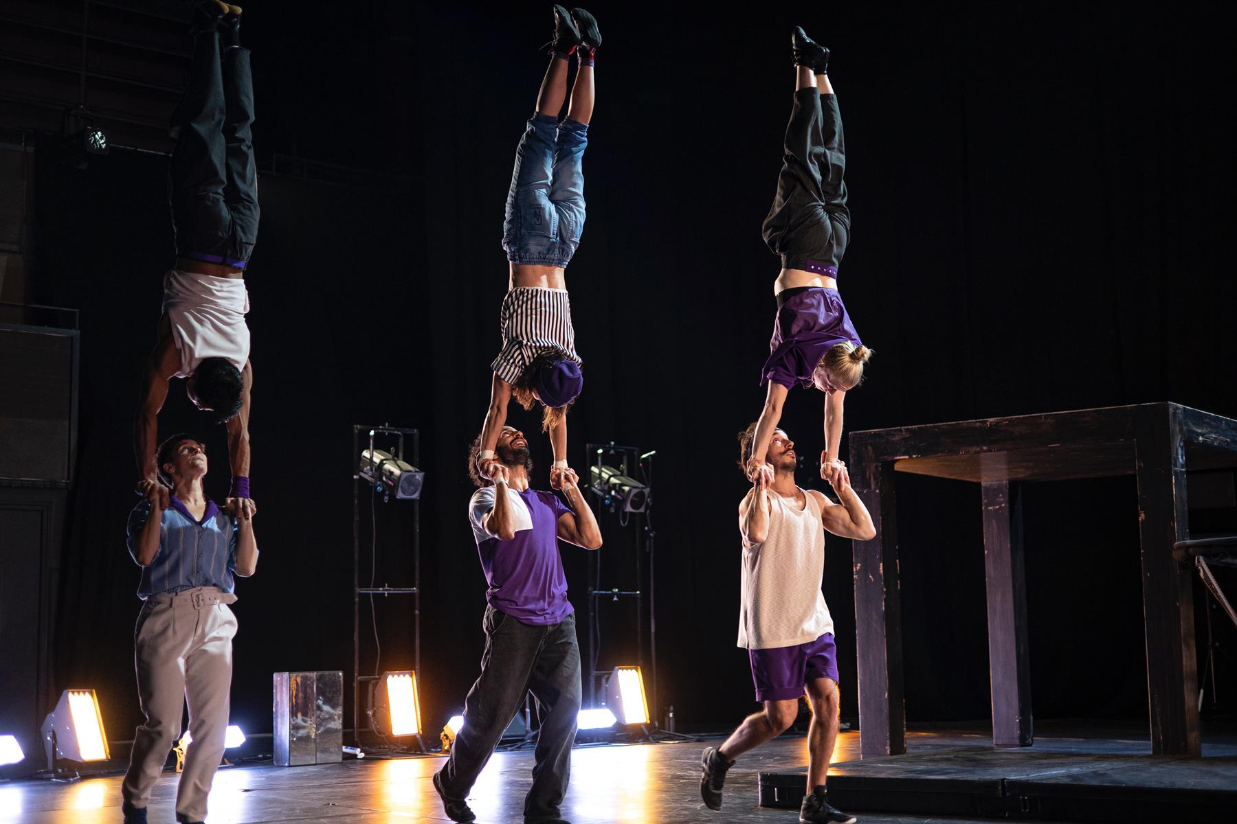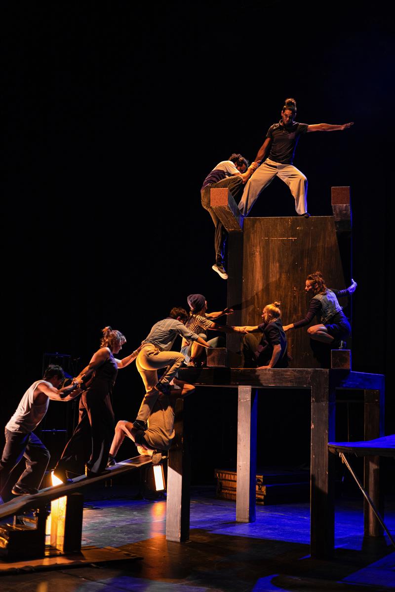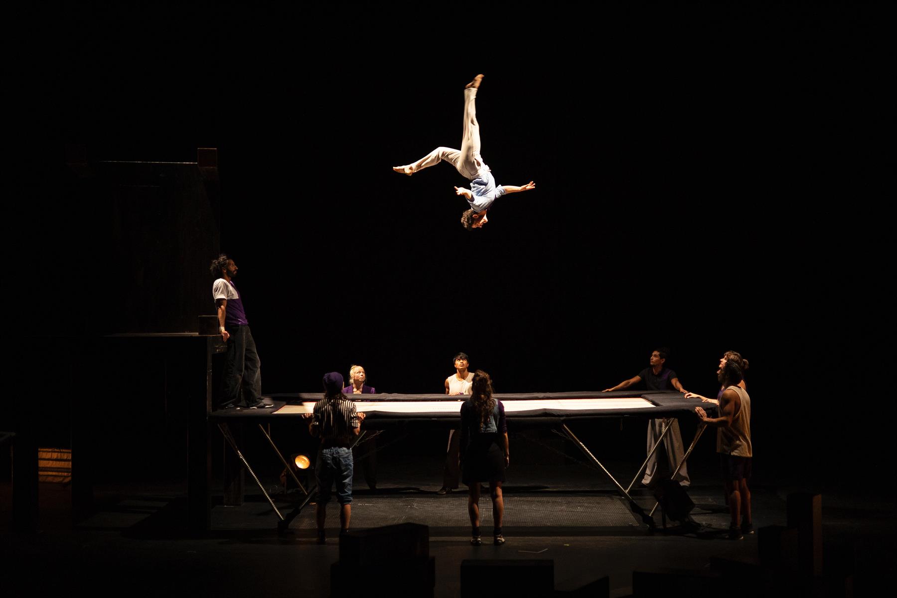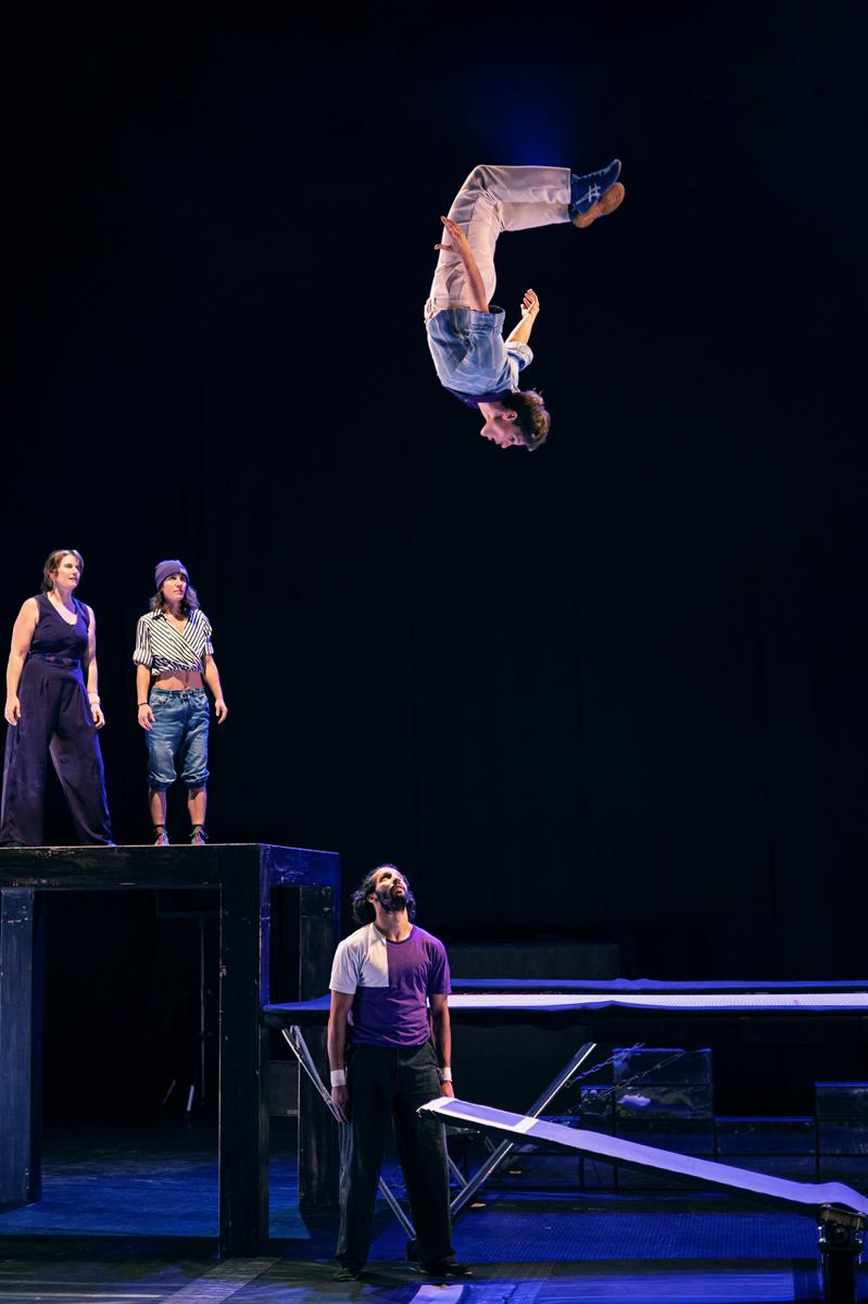Sous couvert d’un concours et d’un défi à la gravité, la performance va bon train, enchaînant les acrobaties au trampoline, à la bascule, ou les portés. Mais c’est sans doute pour mieux interroger, au cœur de l’humain, ce qui nous pousse à franchir le cap, à faire le grand saut, à accepter la chute ou rechercher le rebond dans toutes les étapes de nos vies.