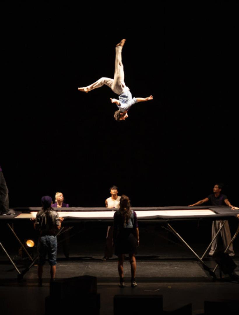 Sous couvert d’un concours et d’un défi à la gravité, la performance va bon train, enchaînant les acrobaties au trampoline, à la bascule, ou les portés. Mais c’est sans doute pour mieux interroger, au cœur de l’humain, ce qui nous pousse à franchir le cap, à faire le grand saut, à accepter la chute ou rechercher le rebond dans toutes les étapes de nos vies.