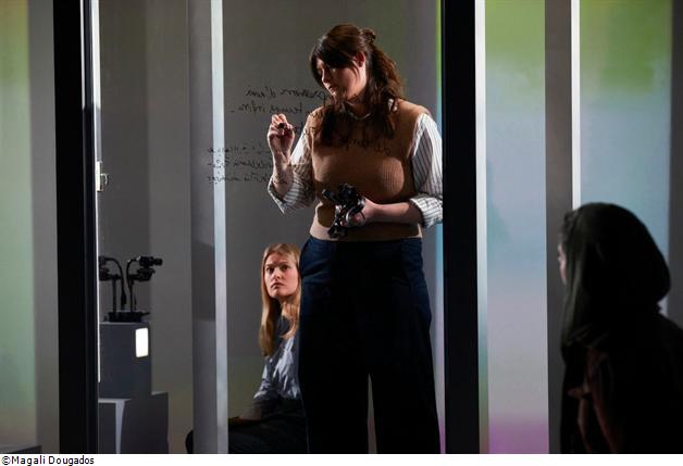 Pour ce nouveau spectacle, Amir Reza Koohestani tisse ensemble les points de vue, les langues (français, anglais, farsi...), et les médias, à travers un dispositif vidéo où les actrices sont filmées en direct. Coincés, les personnages, lointains héritiers de Beckett, doivent contourner les mots pour se comprendre. Bribes de paroles et éclats de subjectivité surgissent dans ce théâtre de l’intime, où l’essentiel advient de manière feutrée. Tous les rôles, y compris masculins, sont joués par des actrices – quatre femmes pour représenter l’humanité tout entière.