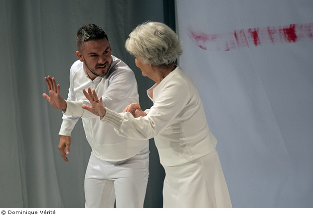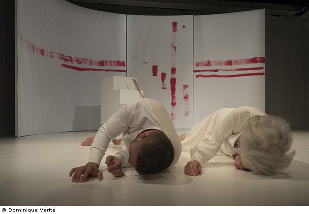 Le plateau est une page blanche, circulaire. La page s’écrit dans un goutte à goutte de peinture rouge qui marque le temps. Deux corps, deux danses, deux âges se rencontrent pour habiter ce paysage dessiné par la fulgurance des gestes calligraphiques et chorégraphiques. Françoise Bal Goetz, danseuse classique et contemporaine, aérienne, et Jordan Malfoy, danseur de hip hop, ancré au sol, presque cinquante ans d’écart, jouent leurs présences au monde.