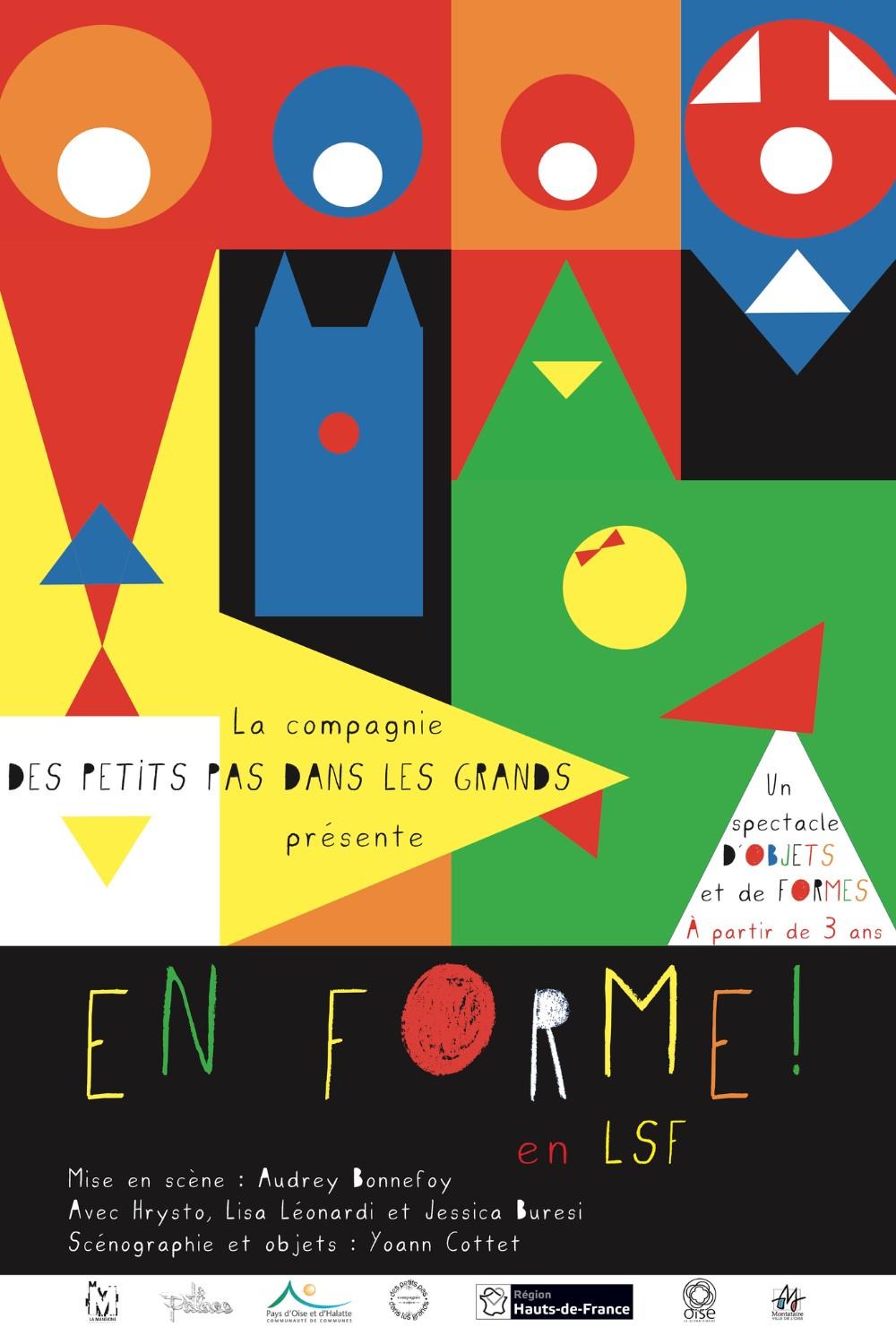 En Forme ! en LSF est un spectacle bilingue (français et langue des signes) pour les tout-petits dès 3 ans. À travers des formes colorées et objets simples, il revisite des histoires et comptines connues comme Boucle d’or ou Petit escargot.