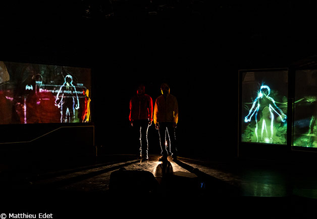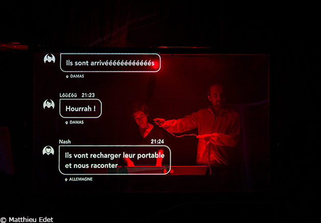 Les artistes au plateau s’emparent concrètement de ces questions, interrogeant alors leur propre rapport à l’immigration et leurs propres difficultés à incarner l’espace virtuel qu’est WhatsApp. Pendant que cette mise en abîme se construit, ce sont les « personnages » de Dana, Kholio et leur famille qui émergent peu à peu. »