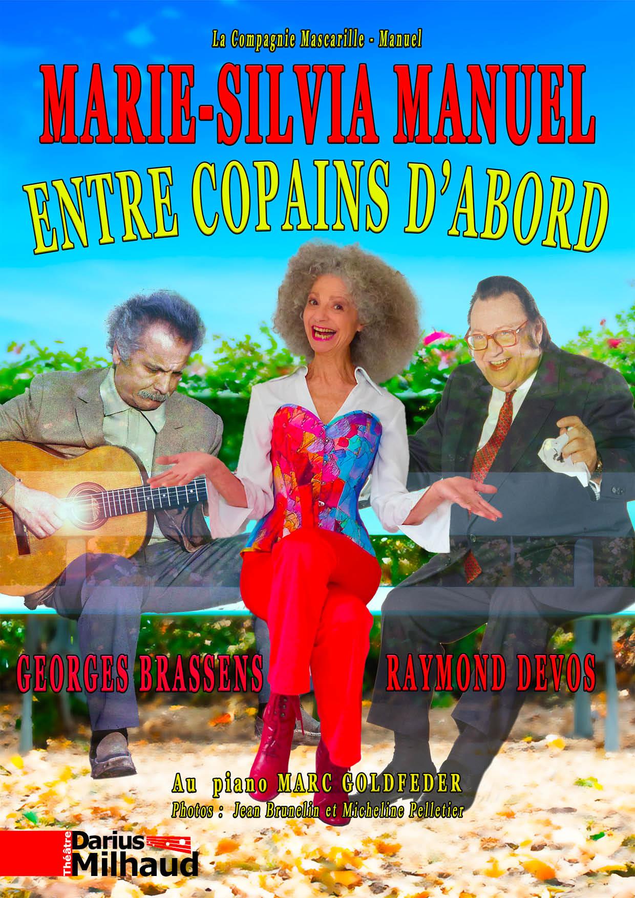 Georges Brassens et Raymond Devos, deux artistes, deux amis, deux êtres exceptionnels que Marie-Silvia Manuel et Marc Goldfeder interprètent dans un spectacle tendre et joyeux. Marie-Silvia, comédienne-chanteuse-diseuse-amoureuse des mots, chante Brassens avec gourmandise, et dit Devos avec régal. Marc, directeur musical-pianiste-orchestrateur, l’accompagne au piano avec l’œil qui frise et le flegme du partenaire discret et efficace. Et c’est vraiment être entre copains que de chanter les vers de Georges et de réagir à l’absurde de Raymond.