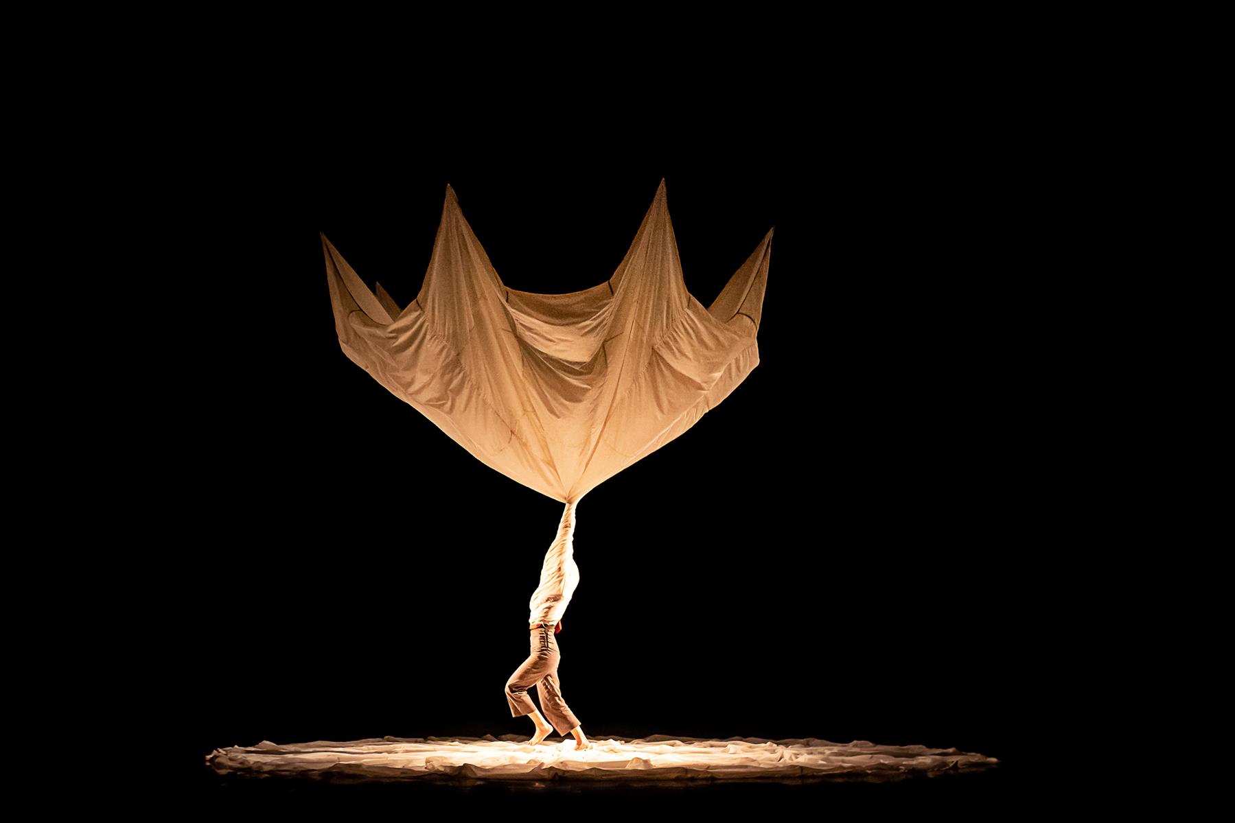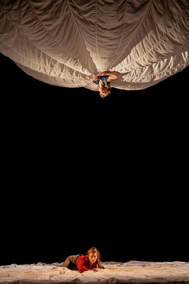 En guise d’agrès, deux parachutes, comme deux planètes. Et, dans l’éther qui sépare ces deux astres jumeaux, deux corps qui dansent et voltigent. C’est de la rencontre qu’il est question ici. On s’étonne de cet autre, qui est un peu nous. On dialogue, sans mot dire. On s’accroche. On fraye des chemins que l’on ne soupçonnait pas. Sous le signe du deux, on (se) compose et on (s’)invente. À partir de 5 ans.