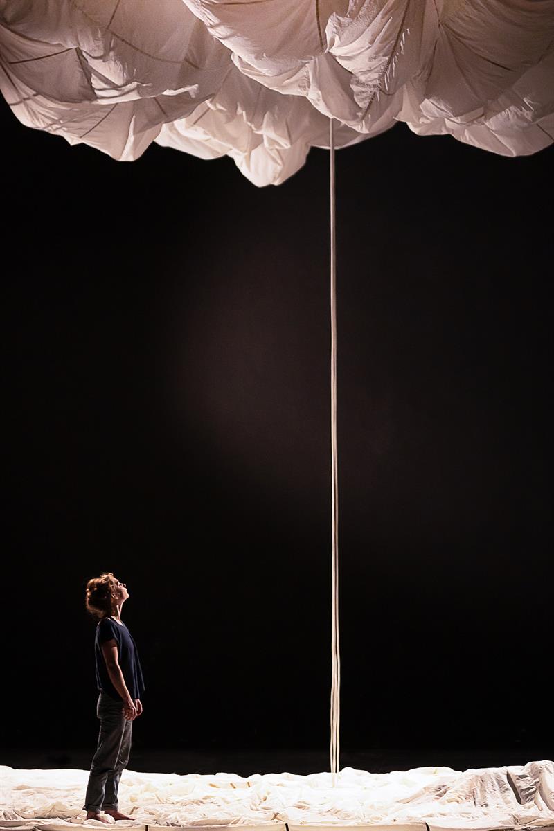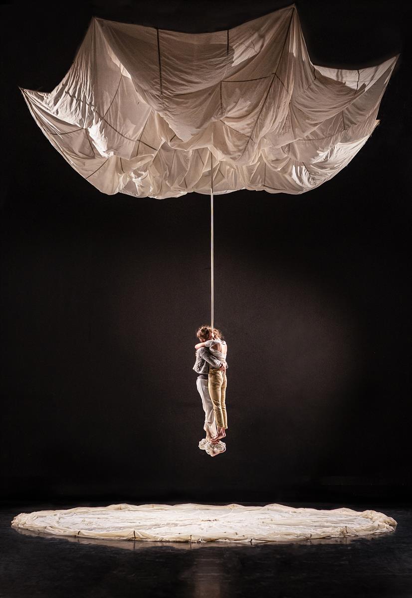 En guise d’agrès, deux parachutes, comme deux planètes, qui vivent, gonflent, respirent. Et, dans l’éther qui sépare ces deux astres jumeaux, entre ces deux ventres de toile, deux corps qui dansent, voltigent, gravitent sur des cordes. C’est de la rencontre qu’il est question ici.