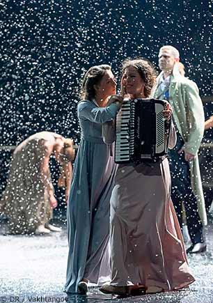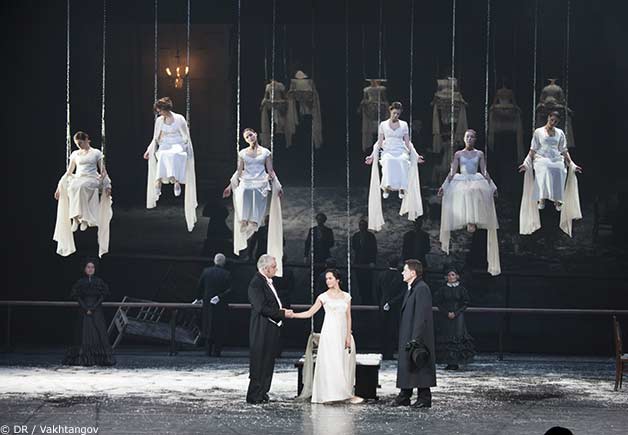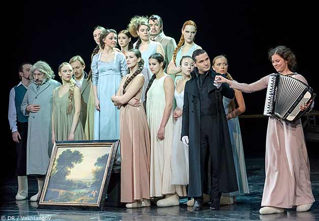 Il n’est finalement pas fréquent de monter Eugène Onéguine au théâtre. On le présente la plupart du temps dans ses versions opératique ou chorégraphique. Et même si tout le monde connaît Pouchkine en Russie, peu sont capables de comprendre la portée du poète. Rimas Tuminas a choisi de ne mettre en scène que la ligne principale de l’œuvre, à savoir l’amour que porte Tatiana à Onéguine. Avec cette mise en scène, il pénètre au cœur de l’âme russe avec lyrisme et passion.