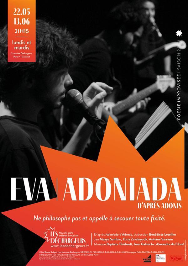 L’ensemble EVA propose une adaptation musicale improvisée d’Adoniada, le dernier recueil du poète syrien Adonis. A travers les nombreux voyages et exils de l’auteur, la recherche individuelle se mue en quête universelle. Pour Adonis, l’acte de création porte la question de l’identité : qui suis-je ? Il s’agit bien sûr ici de célébrer la mobilité dans l’identité, la subjectivité de l’individu dans la foule, le sujet dans le chœur des voix anonymes. Ici, texte et musique se mêlent joyeusement dans un bazar que l’on dirait étrange, dantesque et émouvant.