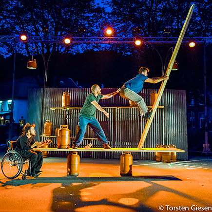 Ici, les bouteilles de gaz et des planches brinquebalantes ont remplacé les instruments traditionnels du cirque, rendant les tableaux encore plus réalistes. Tout au long du spectacle, les trois compères défient les lois de la physique, et si un seul d’entre eux commet un faux pas, c’est la chute ! Mais la solidarité reste de mise et les catastrophes prévisibles évitées in extremis !