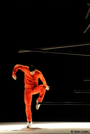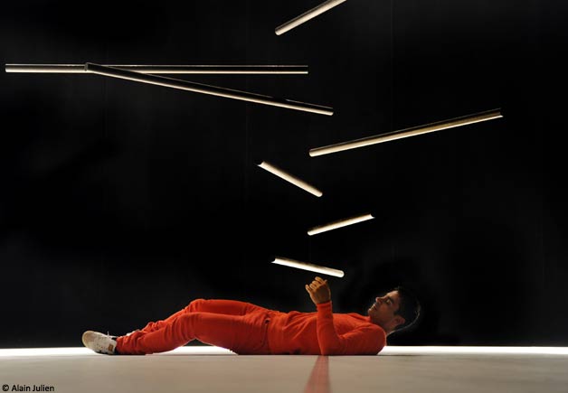 Le chorégraphe-interprète danse avec un mobile composé de neuf tubes horizontaux, à la légèreté d’une ballerine classique. L’œuvre de Xavier Veilhan devient marionnette à manipuler autant que partenaire de jeu pour Fabrice Lambert. Le mobile n°8, alter ego du danseur, ploie et se déploie, structurant toujours différemment, par un jeu d’ombres et de lumières l’espace scénique, tantôt abri, refuge ou bien encore paysage complexe. « Pas de deux » subtil entre un danseur inspiré et un objet d’art puissamment évocateur, Nervures bouleverse les frontières de la représentation et offre au spectateur une possibilité de rêveries infinies.