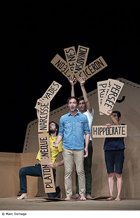 Aujourd’hui, loin de proposer une profération lyrique et solitaire de cette Lettre de Lord Chandos, elle réunit sur le plateau quatre interprètes pour concevoir des principes ludiques incongrus, dans la droite lignée de Gonzo conférence (2007) ou Je suis un metteur en scène japonais (2011) : diviser corps, voix, souffle, ponctuation pour les répartir sur plusieurs acteurs peut-être, décortiquer le texte à la façon d’une partition musicale sans doute... Inventer des délires linguistiques, des constructions oulipiennes et d’improbables carcans pour nous permettre, par le théâtre, de réentendre nos mots.