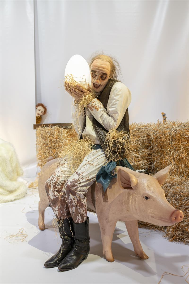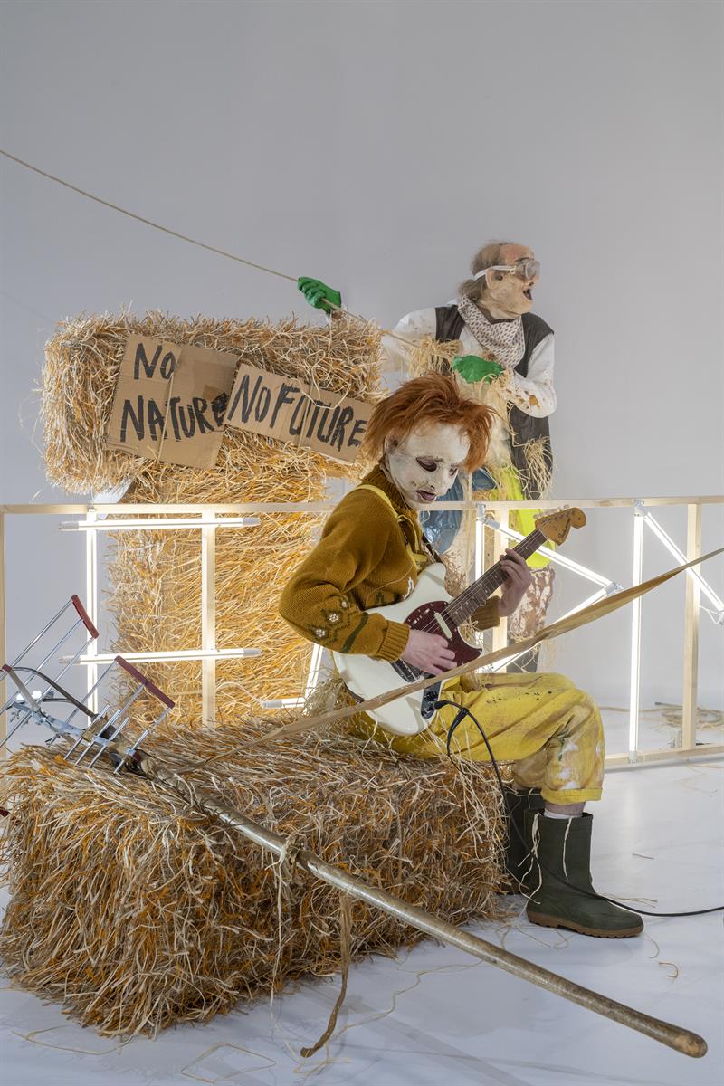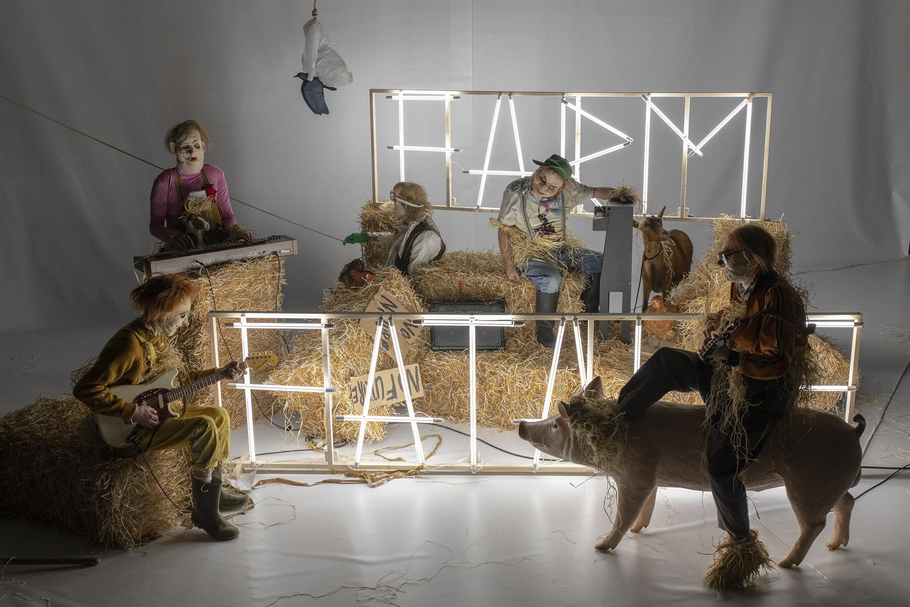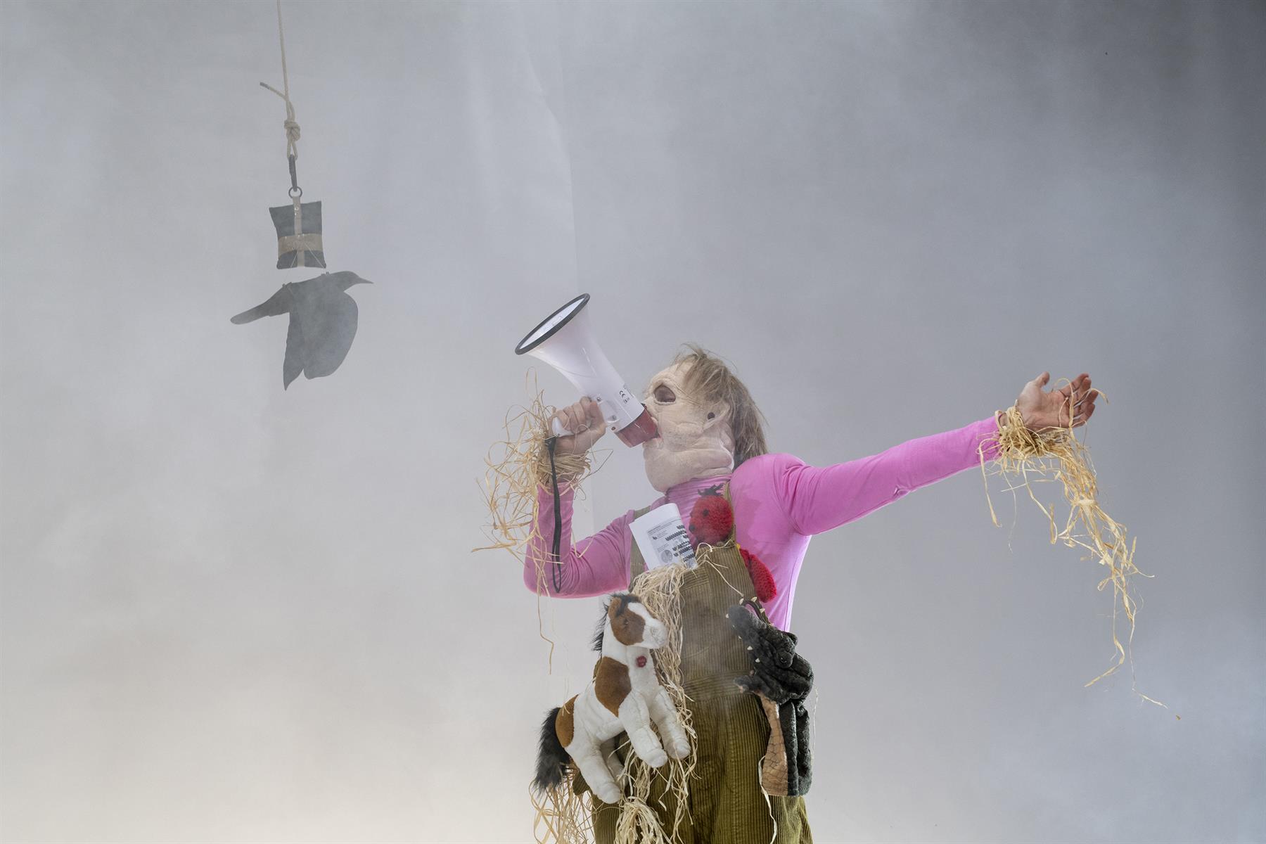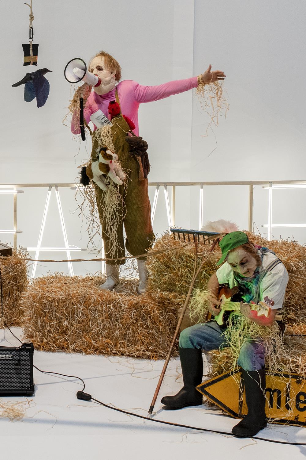 Imaginez une ferme sans terres à cultiver, sans animaux, sans fermiers, où même les bruissements de la nature se font rares. Sur un fond blanc quelques fourches, une dizaine de bottes de paille, un ou deux cochons en résine évoquent un semblant de structure agricole. Cinq créatures, à la croisée de l’homme, de la marionnette et de l’épouvantail, subsistent pourtant dans cet environnement post-apocalyptique. Armés de l’espoir d’un monde meilleur, ils ne cèdent jamais à la nostalgie, mais multiplient au contraire d’infimes et joyeuses actions de résistance. De la radio-pirate, en passant par l’interview de la dernière des abeilles, jusqu’au recensement des sons produits dans leur biotope, ils créent les fondements d’une communauté autonome et solidaire.