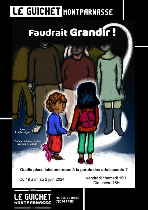 Cette attitude met en péril son parcours scolaire (devoir non rendu, retard...) et les adultes qui l’entourent l’enjoignent à « plus de maturité ». Faudrait Grandir ! est un spectacle à destination des collégiens qui interroge les violences des adultes envers les enfants.