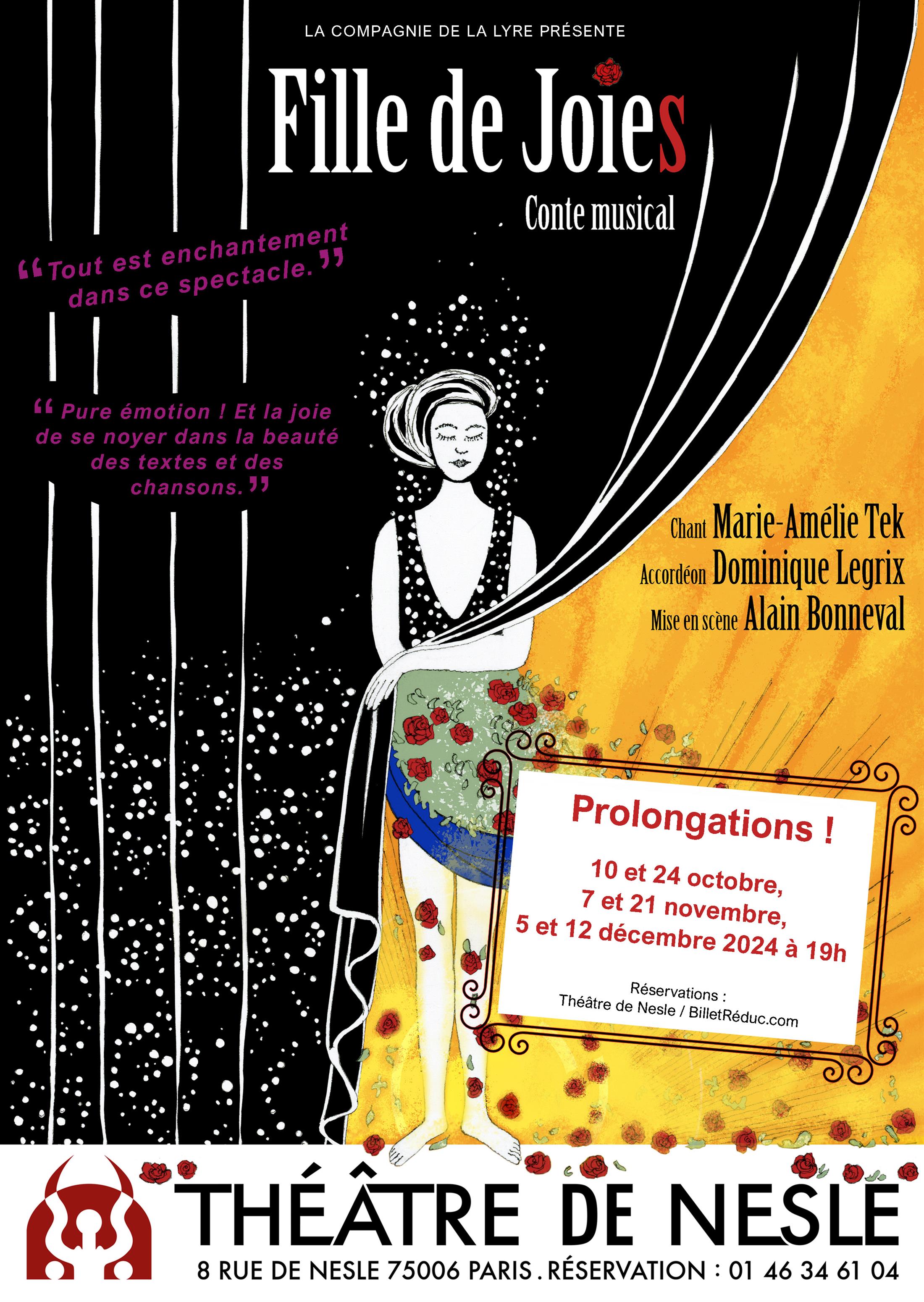 Fille de Joies est un conte musical porté à la scène par un duo chant-accordéon. Des trottoirs des faubourgs populaires aux salons de la bourgeoisie, une jeune femme fait de sa vie un rêve, le chemin de son émancipation et la voie de sa liberté.