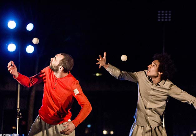 Entre les corps élastiques de deux jongleurs et les balles explosives qui surgissent, se forment des lignes courbes et molles… Rattraper une balle en remplaçant l’efficacité par la mollesse est tout un art, que ces circassiens à l’esprit joueur entretiennent malicieusement. Suivant les dessins au sol et guidés par les lumières qui redessinent les murs, ils évoluent dans un espace où tout leur est permis, même, et surtout, tomber. Sur des sons électroniques, la musique s’emballe et les balles virevoltent de plus en plus vite. C’est tout ce paradoxe sur lequel surfe ce spectacle qui développe son imaginaire acrobatique et burlesque loin des codes classiques du jonglage.