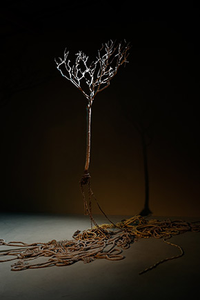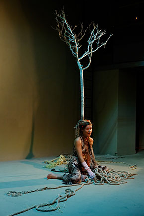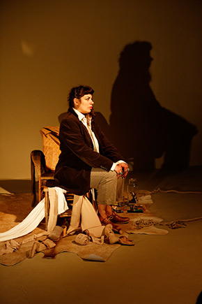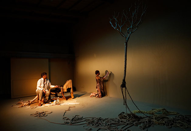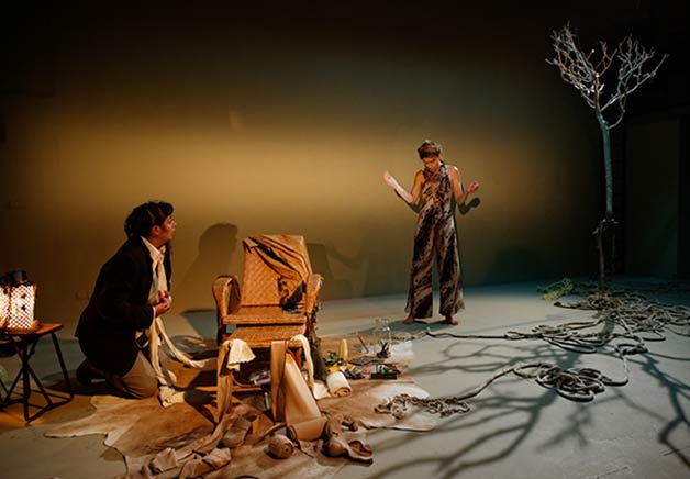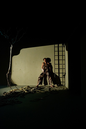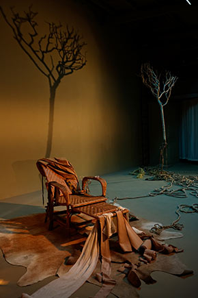 Il ne s’agit pas d’une pièce historique ou biographique. Il ne s’agit pas d’un montage de textes écrits de la plume de Frida, ou de témoignages : il s’agit d’une divagation. Je rentre dans l’univers de la peintre par un tableau, « Le petit cerf ». Dans une clairière, un cerf tombe sous les flèches. Il a le visage de Frida Kahlo, un corps d’animal martyr et une figure humaine. Je sépare, Frida et le cerf : je féminise. Le cerf devient biche. Deux personnages pour un autoportrait. La recherche se porte autour du poème de l’incarnation.