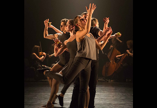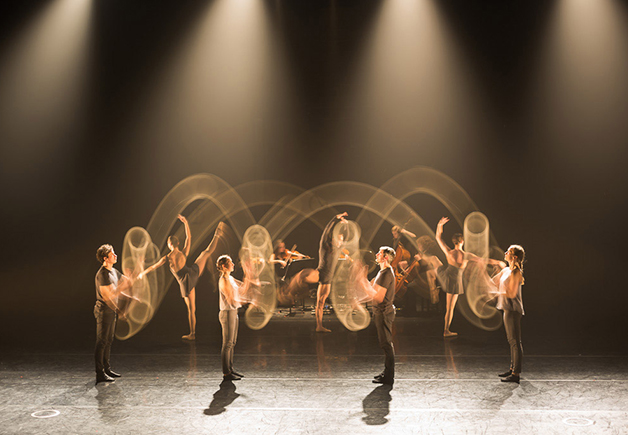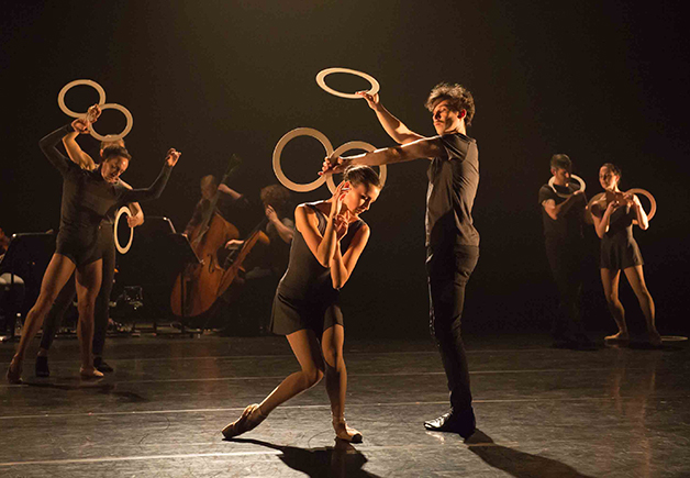 Celui du ballet classique et celui du jonglage, chacun partageant une architecture imaginaire et éphémère. Avec leurs balles, anneaux et massues, les jongleurs dessinent des arcs, tracent des lignes et sculptent des arrondis que les danseurs interprètent. Dans une esthétique éblouissante les deux univers se croisent ou se mélangent, les jongleurs dansent, les danseurs s’essayent à jongler, l’humour fait le reste. Mais le mariage ne s’arrête pas là, puisqu’ils invitent aussi sur scène un quintet à cordes et c’est fascinant comme tout s’imbrique naturellement.