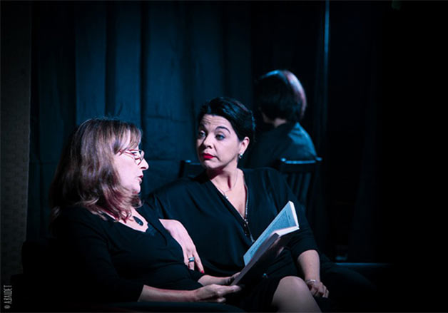 Un couple de femmes, pensives, « face public » ; une autre assise, de dos dans la pénombre. Tandis que la musique s’estompe et que l’obscurité fait place à la lumière, le jeu complexe de ces trois femmes se dévoile.