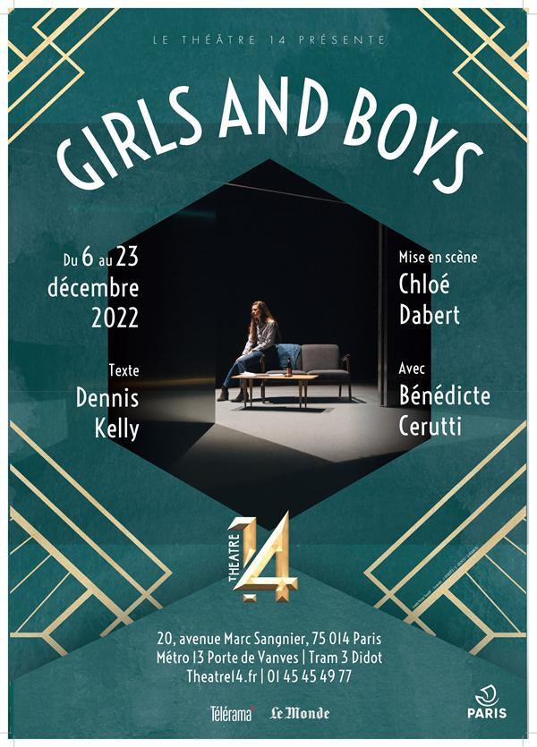 D’abord, le coup de foudre dans les couloirs d’un aéroport. Tout commence par le rire, la fête, le bonheur. Le couple aura deux enfants, avant la débâcle. Et la fin de l’amour, comme une descente en spirale vers la guerre domestique, et l’irrémédiable. Une femme, seule en scène, appelle ses enfants, puis se rappelle le point de non-retour : l’horreur exactement. Avec Girls and Boys, Chloé Dabert plonge pour la troisième fois dans l'univers de Dennis Kelly.