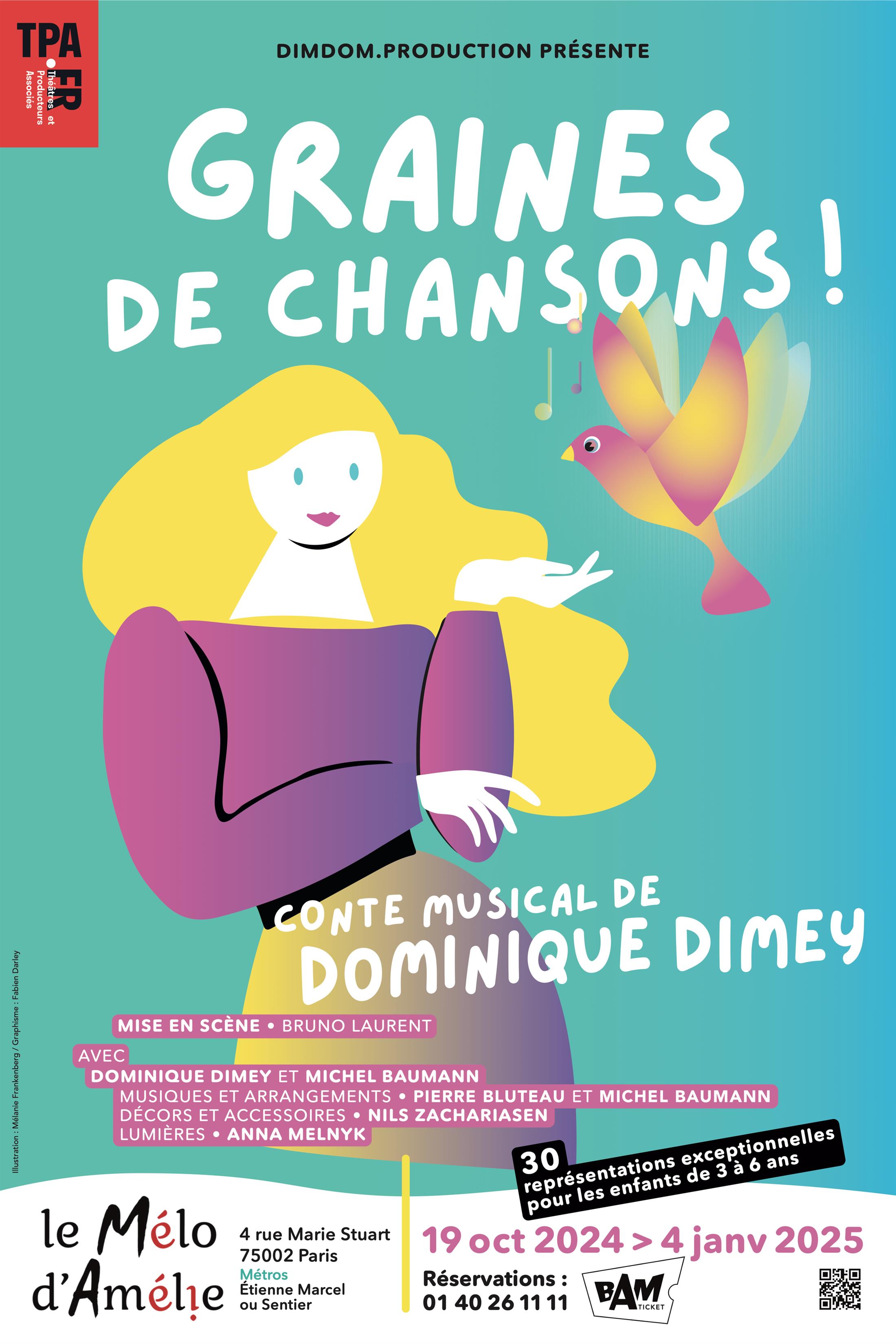 Chanteuse et conteuse, avec talent Dominique Dimey partage avec les enfants un conte plein de tendresse et de rêve… Six chansons à partager, un moment délicieux et délicat pour semer des graines de chansons chez les enfants et leurs parents, et pour leur donner envie de chanter la vie. À partir de 3 ans.