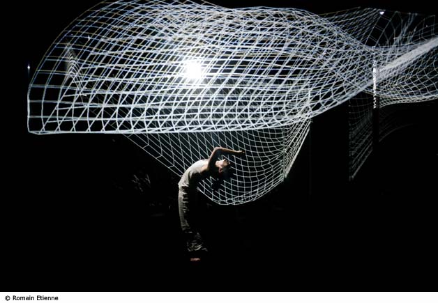 Un cube de tulle blanc constitue l’espace de cette performance. Un dispositif de quatre vidéos synchronisées y projette un univers graphique généré en temps réel. Le corps de la danseuse entre alors en dialogue avec ces images en mouvement au rythme d’une création sonore lyrique qui souligne le caractère onirique de la chorégraphie. À la fin de la représentation, les spectateurs sont invités à déambuler dans l’installation, à l’endroit même que la danseuse a arpenté, chargé de ce qui a été traversé. Ils peuvent prendre la mesure de l’espace et vivre de l’intérieur ce monde visuel en mouvement.